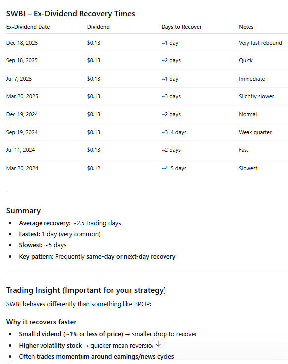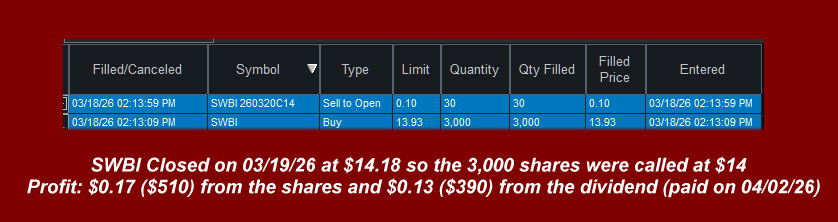 SWBI for its 3/19/26 ex-dividend date: 3,000 shares were purchased, a Covered